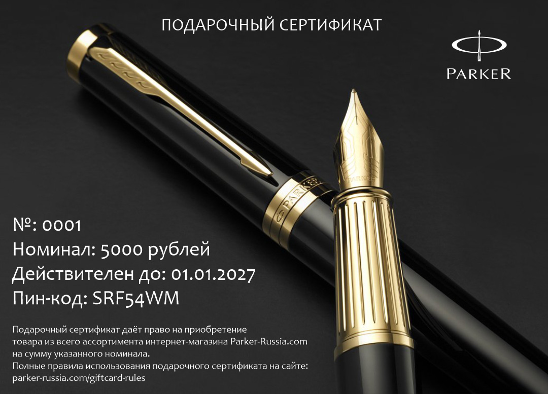 Электронный сертификат гибкого номинала от официального дилера Parker в Тамбове. Вы можете дополнительно заказать гравировку, которая подчеркнет Вашу оригинальность и придаст памятность статусному подарку. Все ручки Паркер поставляются в фирменном футляре.